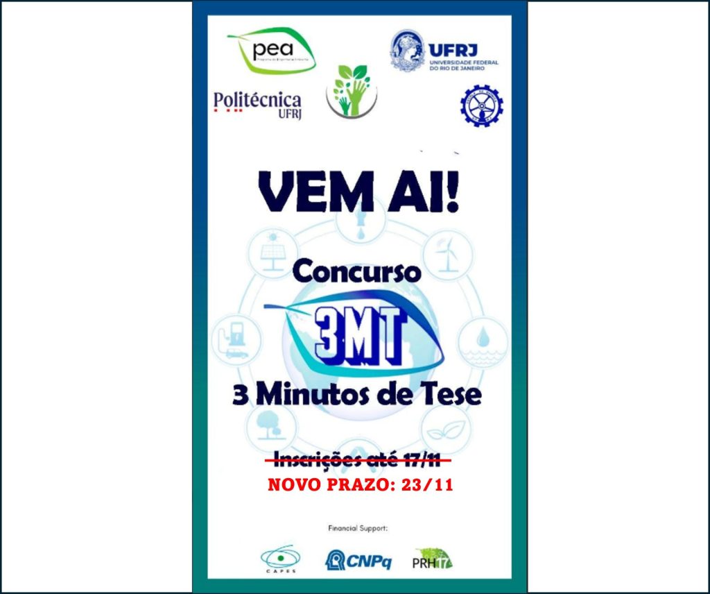 O Concurso 3MT do Workshop PEA 2025 está chegando e você não pode ficar de fora! No 7º Workshop de Engenharia Ambiental da UFRJ (3 a 5 de dezembro), será a sua chance de apresentar sua pesquisa em apenas 3 minutos, de forma clara, criativa e impactante. 🌱💡